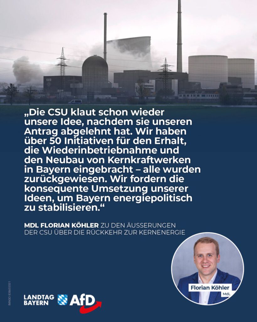 Florian Köhler: Kleine modulare Reaktoren: CSU kupfert bei AfD ab – Eine echte Kernkraftwende gibt es nur mit der AfD!