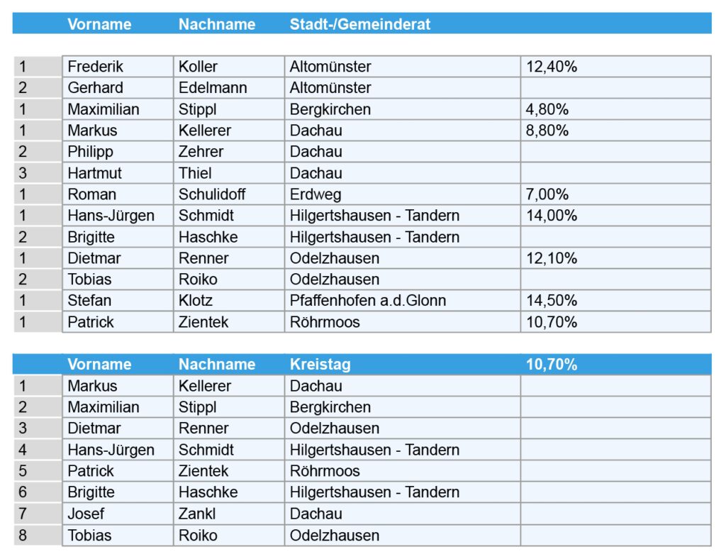 Des Weiteren tritt die AfD-Dachau auch in 8 Gemeinden des Landkreises Dachau für die Stadt-/Gemeinderatswahlen an: